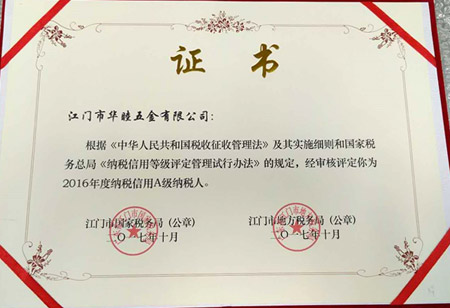 2017年10月,本公司之公司江門華津金屬制品有限公司(以下簡稱“華津”)及江門市華睦五金有限公司(以下簡稱“華睦”)收到江門市國家稅務局及江門市地方稅務局所頒發的《2016年度納稅信用A級納稅人證書》。